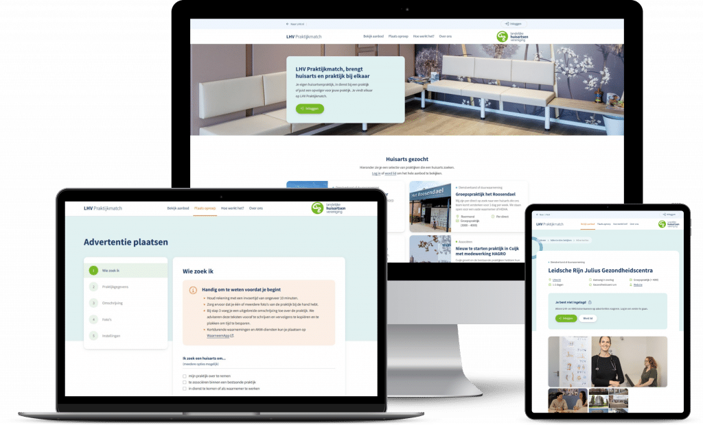Naast LHV.nl en de Academie hebben wij voor de LHV ook de LHV Praktijkmatch (opent in nieuw tabblad) ontwikkeld. Op dit gebruiksvriendelijke online platform kunnen huisartsen een baan of praktijk aanbieden én vinden. Vraag en aanbod komen hier samen op een overzichtelijke website. Via filters, de zoekfunctie en je locatie zoeken huisartsen eenvoudig naar passende advertenties. Het plaatsen van een vacature gaat via een gebruiksvriendelijk formulier, waarbij je bij alle stappen begeleid wordt.